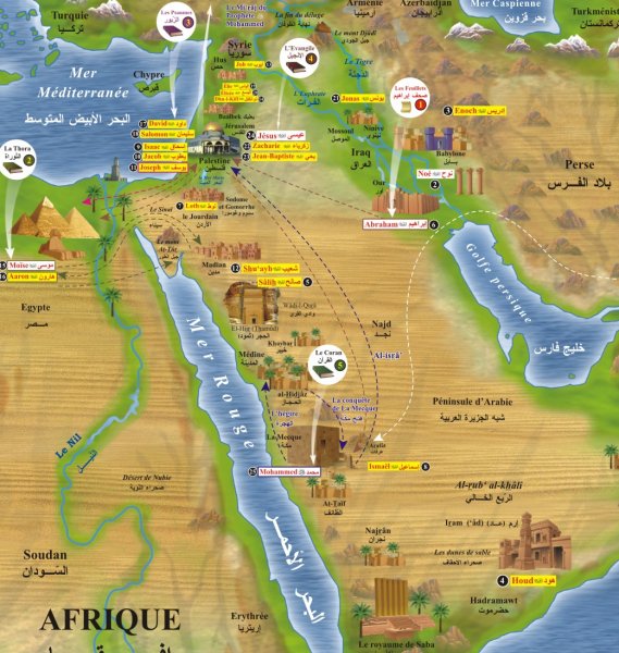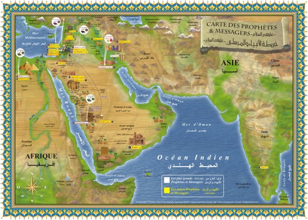Cette carte montre en détail les prophètes et messagers dans leur ordre chronologique ainsi que les lieux où ils ont vécus (les noms des anciennes villes sont mentionnées en parallèle avec appellations des pays actuels afin de donner un point de repère). Les Livres Saints sont également représentés avec leur lieux de révélation. Les parcours des prophètes sont indiqués par des flèches de couleurs distinctes.