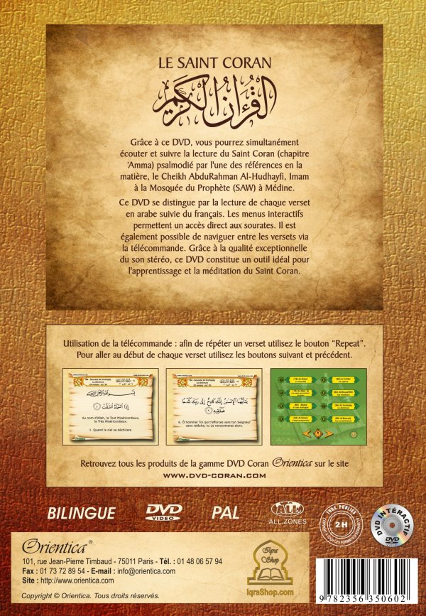 Grâce à ce DVD, vous pourrez simultanément écouter et suivre la lecture du Saint Coran (chapitre ‘Amma) psalmodié par l'une des références en la matière, le Cheikh AbduRahman Al-Hudhayfi, Imam à la Mosquée du Prophète (SAW) à Médine.